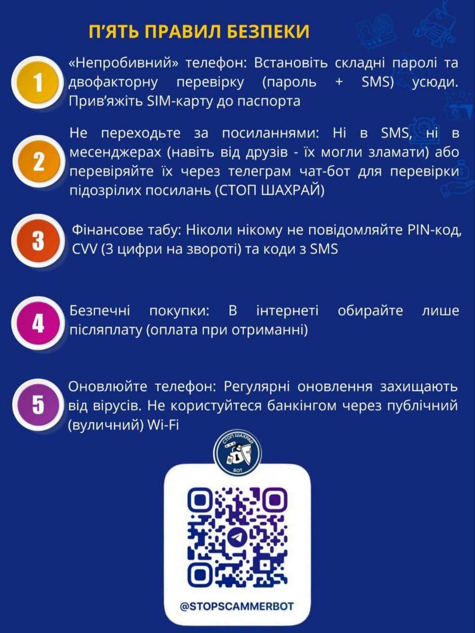 ✔️ нікому не повідомляйте PIN-коди, CVV, паролі та коди з SMS;